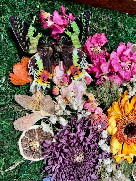 PRESERVED SUNSET MOTH & FLORAL ARRANGEMENT